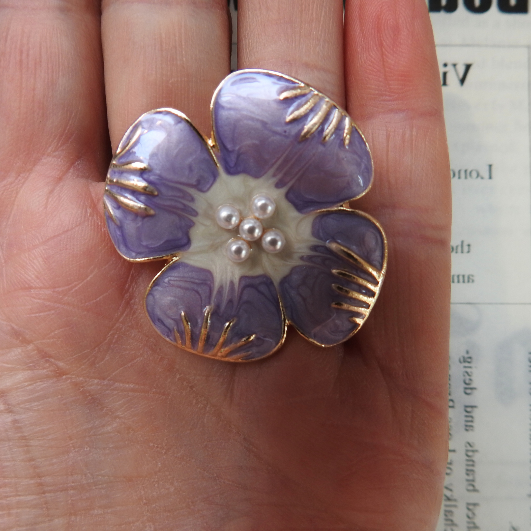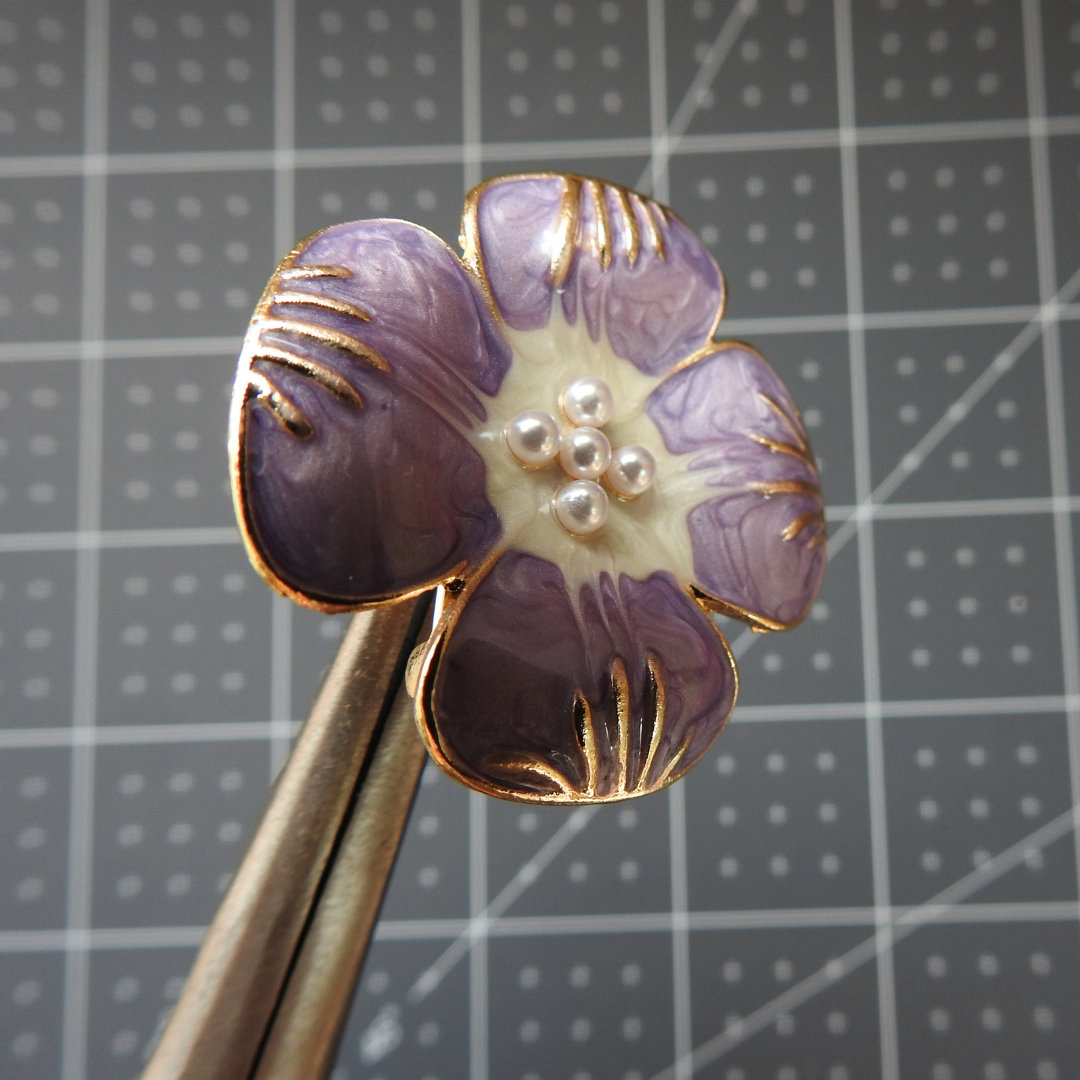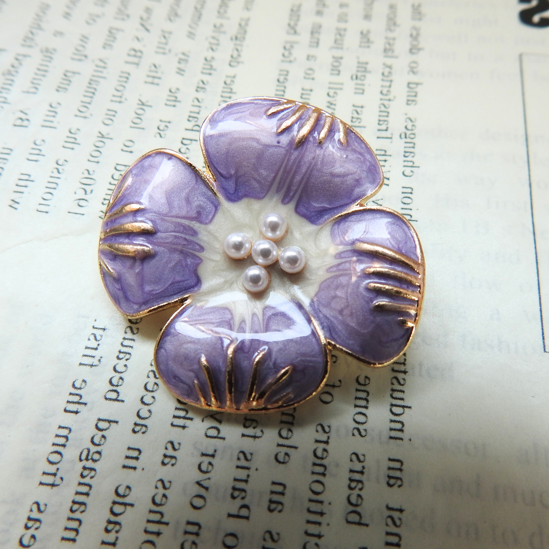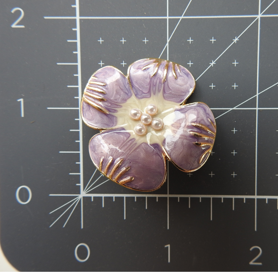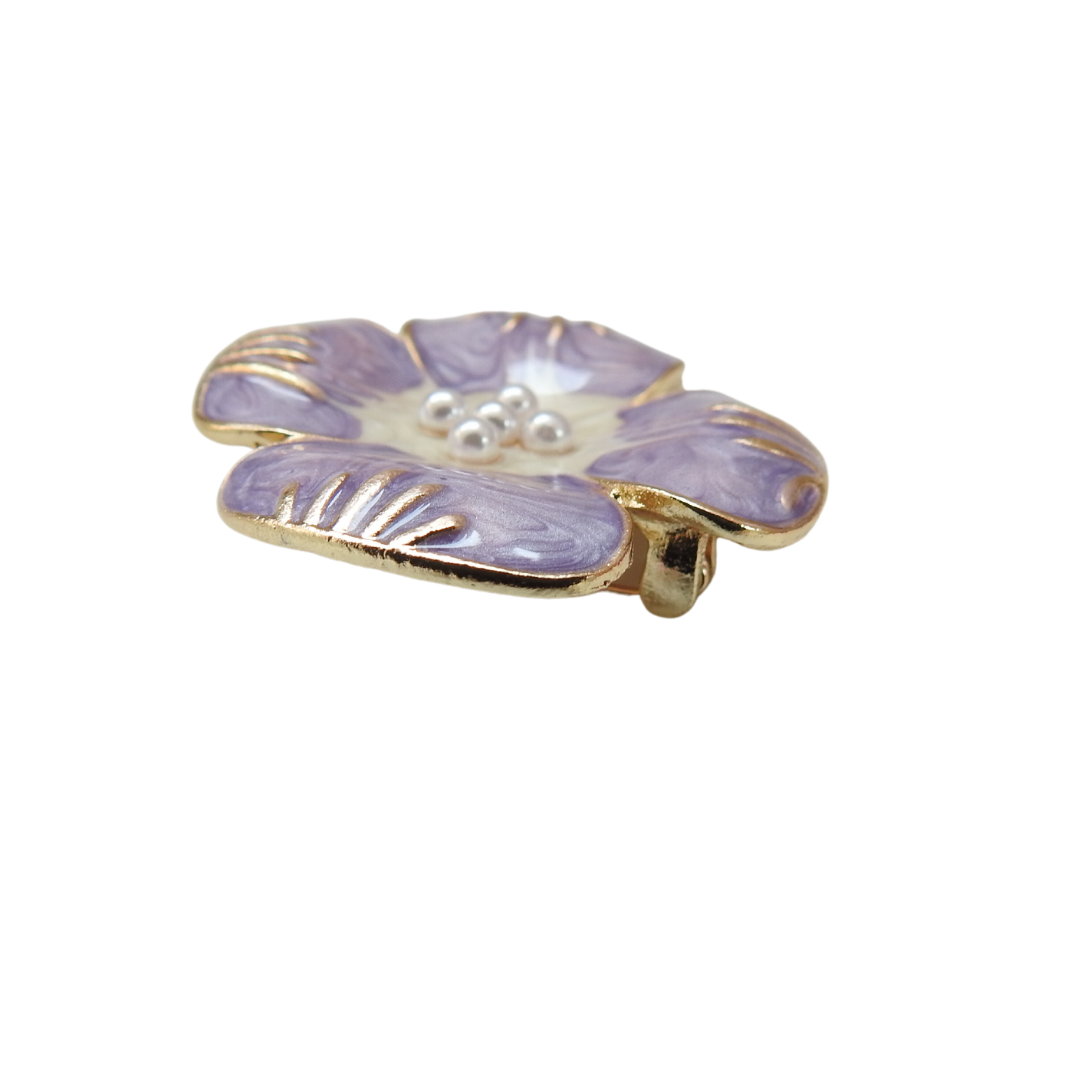 Very pretty little purple flower brooch with tiny pearls at the center. The back of this brooch is golden in color.